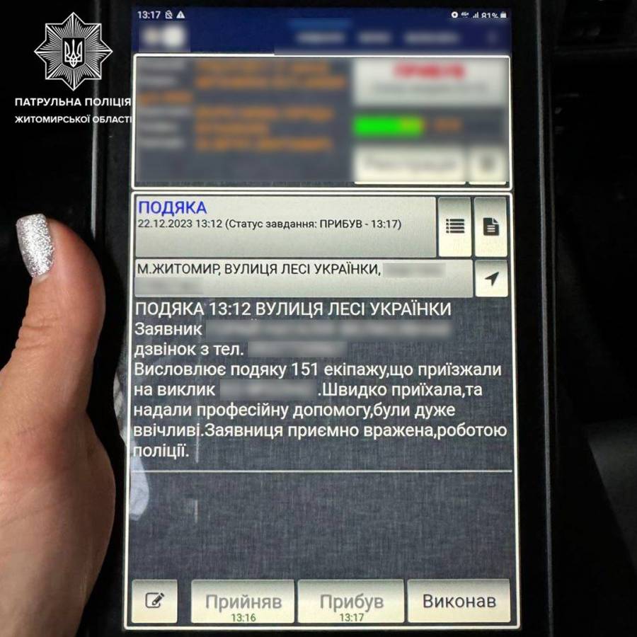 Як повідомили у Патрульній поліції Житомирщини, днями охоронці порядку отримали повідомлення, що на перехресті вулиць Лесі Українки та Небесної Сотні перебуває жінка похилого віку, яка виглядала розгублено.
