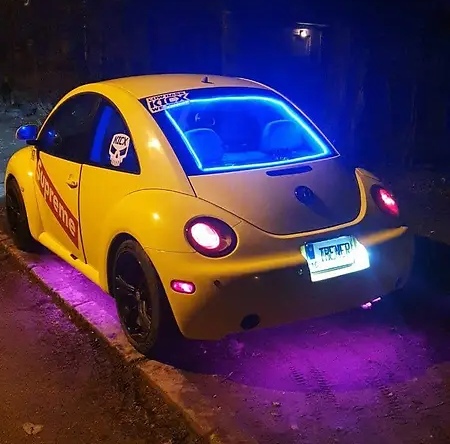 На столичних дорогах можна побачити різні тюнінговані автомобілі, серед яких зустрічаються й дуже яскраві у прямому значенні цього слова екземпляри. Тому приклад ось цей Volkswagen New Beetle 1998 року випуску. У вечірній час машина привертає увагу ефектним світлодіодним підсвічуванням, що переливається різними кольорами як з-під днища, так і з задньої частини салону.