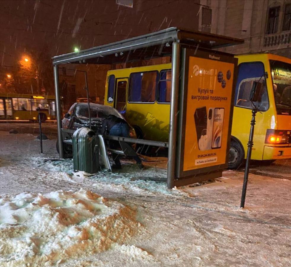 Водій після збиття знаків здійснив зіткнення із зупинкою для громадського транспорту.