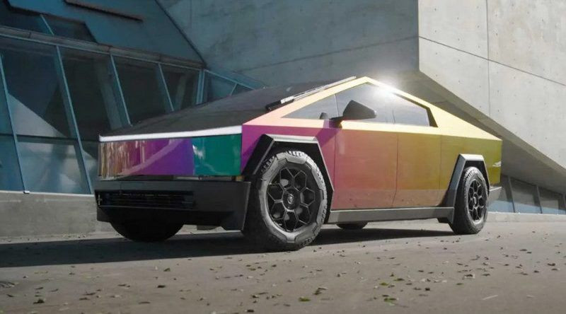 Так само як і оригінальний пікап, він зроблений з нержавіючої сталі та має футуристичний дизайн, але цей Cybertruck впадає у вічі, тому що він покритий вінілом, який T Sportline називає Spectrum.