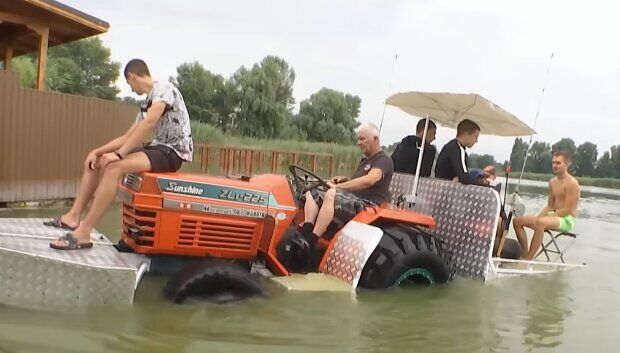 Чоловік створив на базі звичайного трактора цілу “рибальську пристань” із плаваючим причепом.