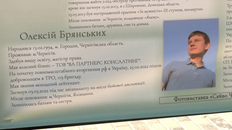 На стенді є і фото 28-річного Олексія Брянських. Він закінчив військову кафедру, був молодшим лейтенантом, добровольцем став на захист Чернігова 25 лютого 2022-го.