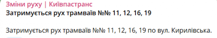 О 13:30 “Київпастранс” поінформував киян про затримку на Кирилівській руху трамваїв № 11, 12, 16, 19.