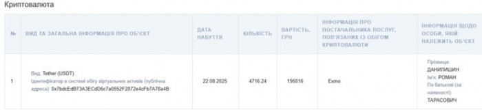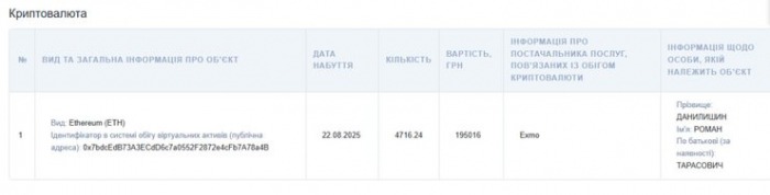 У початковій декларації йшлося, що офіцер за 2025 рік має 4716 ETH, вартість якої була зазначена на рівні трохи більш ніж 195 000 гривень, що зовсім не відповідає ринковій ціні. На це звернуло увагу видання InCrypted.