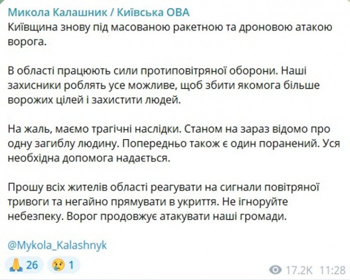 Калашник попередив громадян, що повітряна атака ЗС РФ триває, і тому слід перебувати в укриттях. Також посадовець уточнив, що пораненій людині надається допомога.